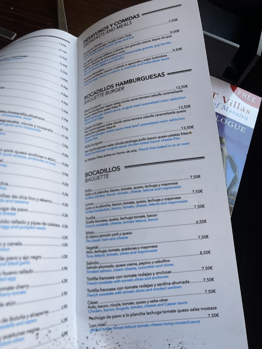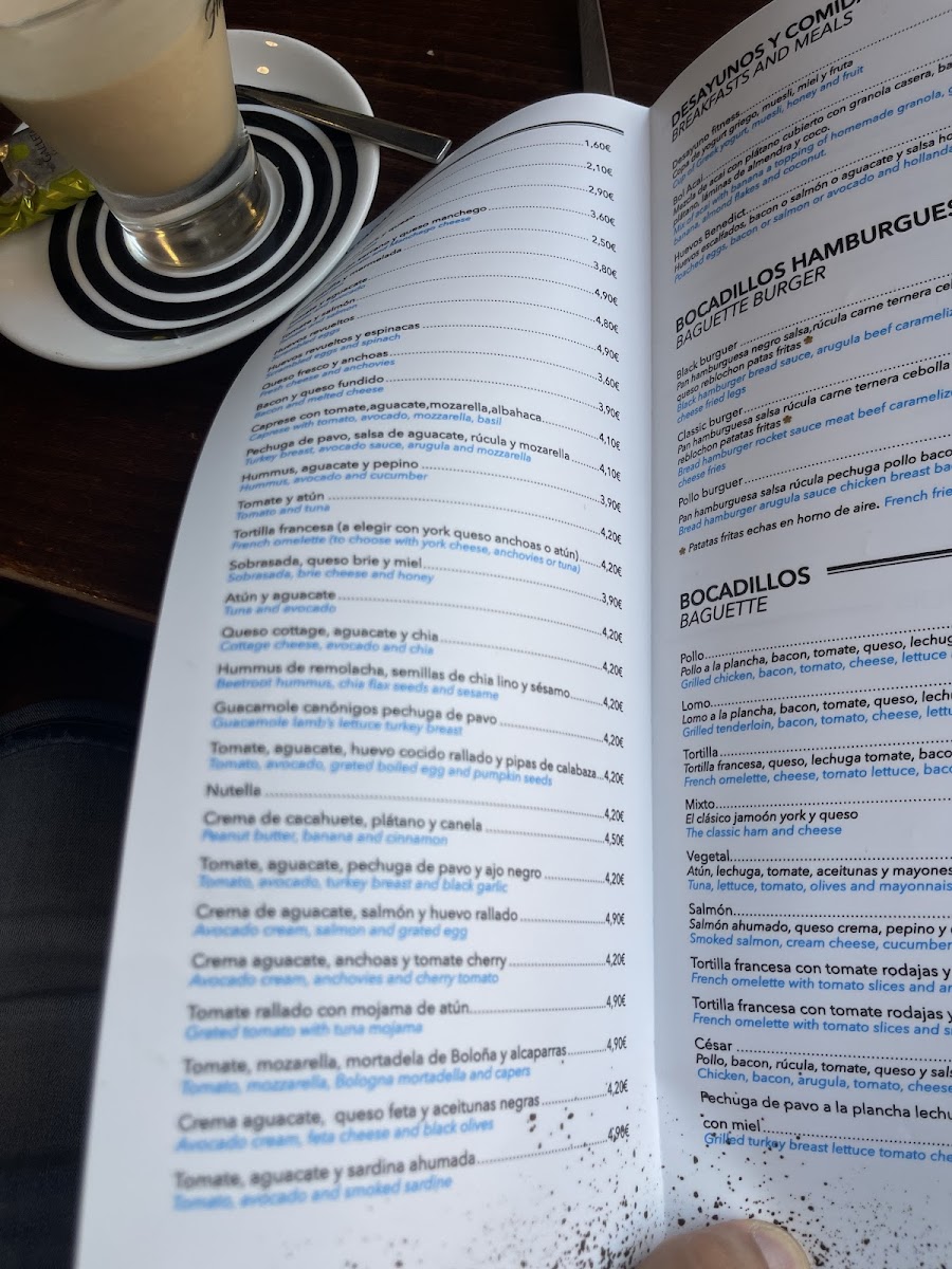Food options include light breakfast and brunch dishes, such as scrambled eggs with anchovies and yogurt with muesli, nuts, honey, and fruit. There are also toasts topped with ingredients like salmon and Philadelphia cheese or turkey and white cheese. Sandwiches featuring combinations such as salmon, avocado, and cheese are also available.